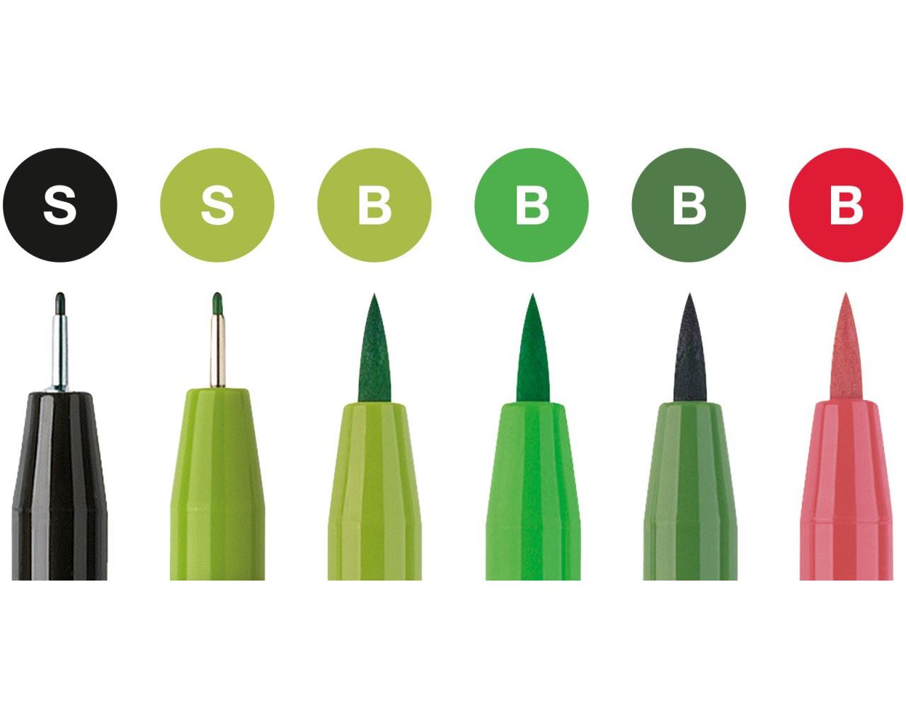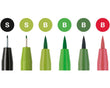 - Content: S = 0.3 mm colours black, may green, B = brush tip colours leaf green, may green, permanent green olive, red